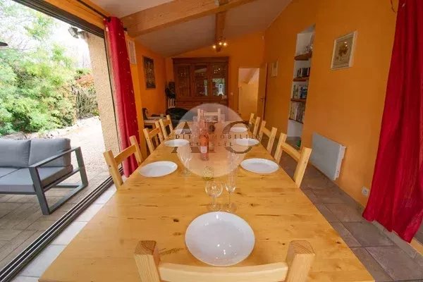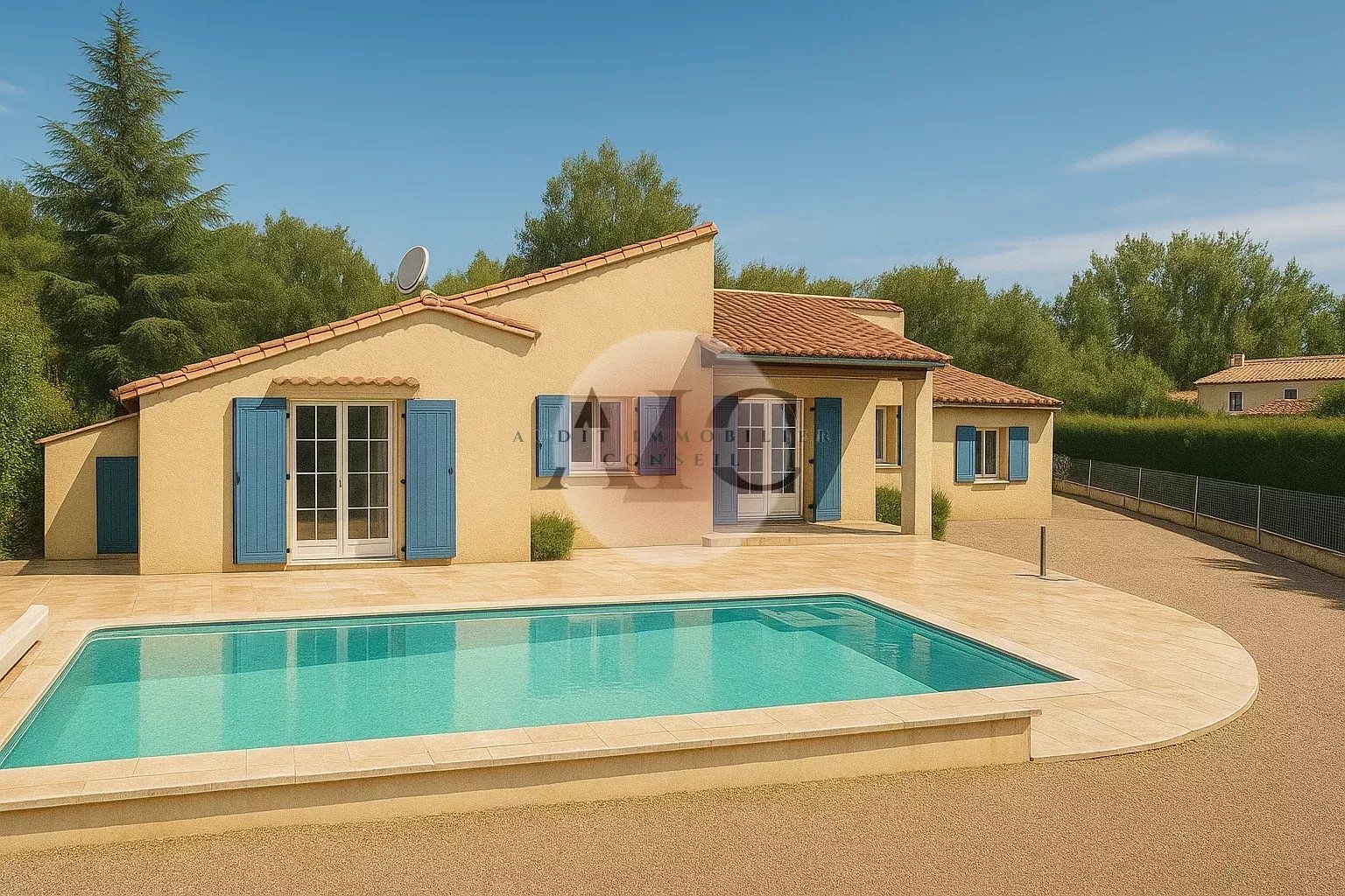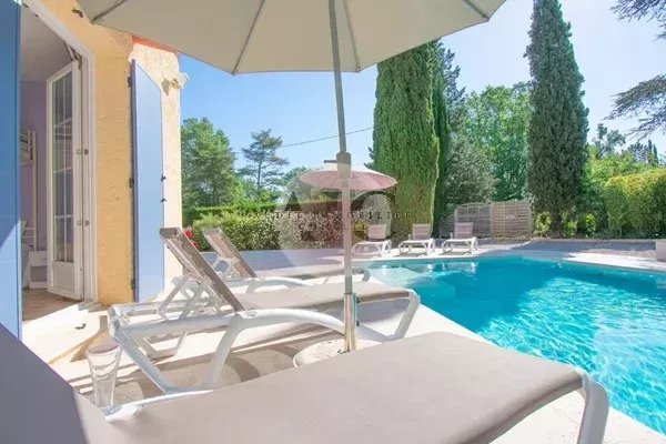 Ref. 1308 - Située à Fayence, au coeur du pays varois, découvrez cette villa individuelle de plain-pied, de 115m², implantée sur une terrain clos de 1270m² parfaitement entretenu et agrémenté d'une piscine chauffée et d'un chalet bois pouvant servir de garage ou espace de rangement. Composée d'un salon avec cuisine équipée US, une grande salle à manger/séjour, 3 chambres dont deux suites avec salle d'eau/wc, un bureau ou 4ème chambre d'appoint avec placard, une salle de bains/wc. L'extérieur invite à la détente avec une grande terrasse exposée sud, une piscine récente chauffée et de nombreuses places de stationnement.Idéale en résidence principale confortable, ou en maison de vacances clef en mains et investissement locatif rentable