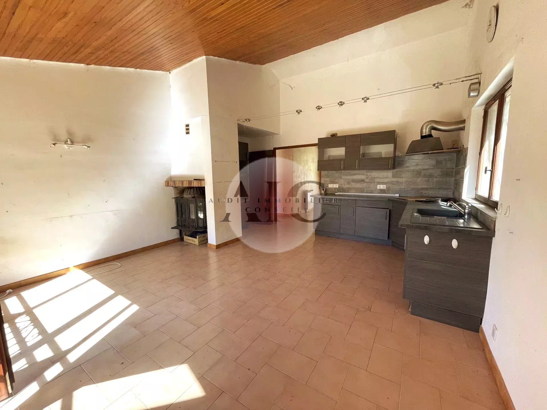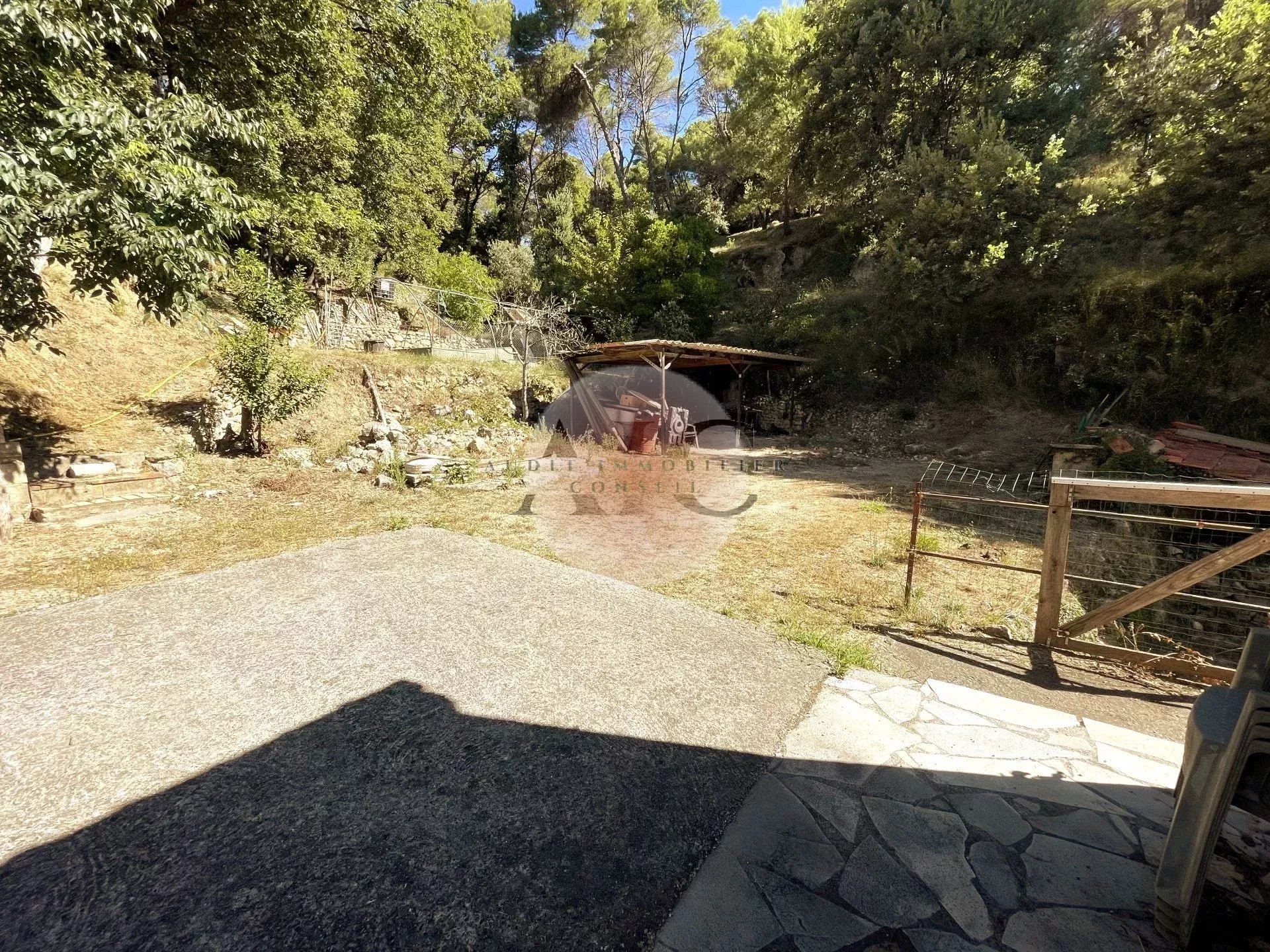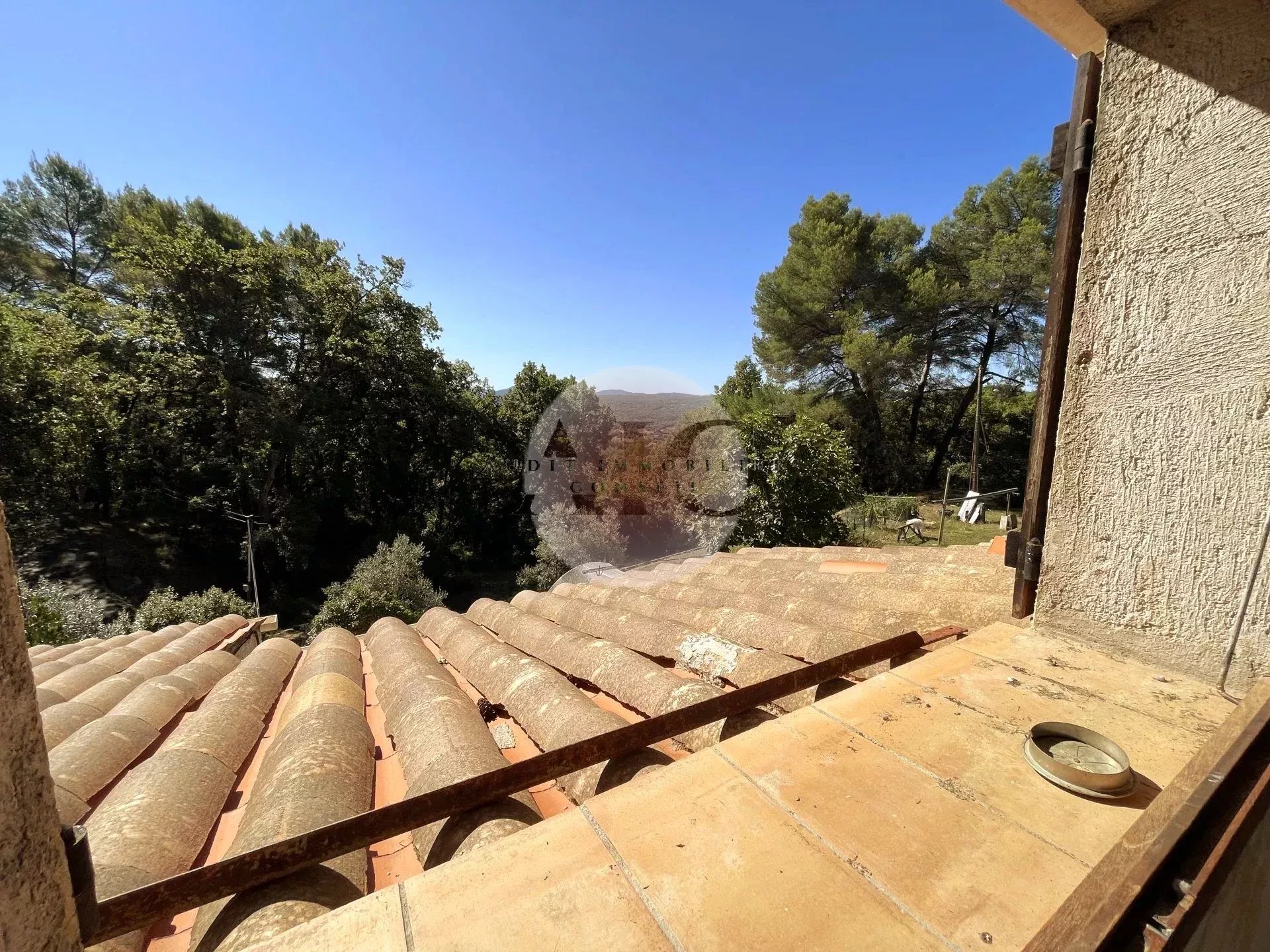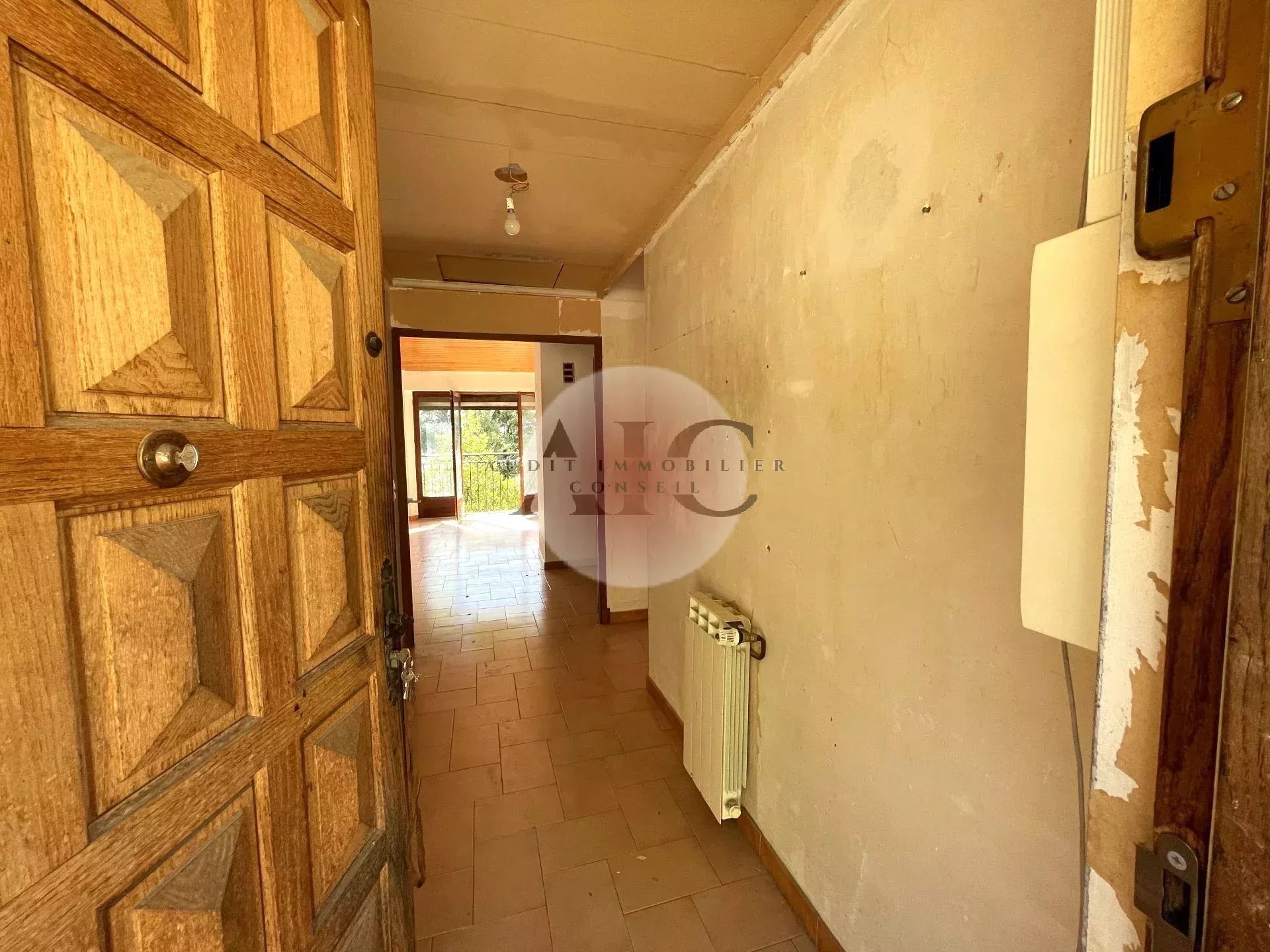 Ref. 1293 - A rénover, villa mitoyenne d'environ 80m² avec très belle vue dégagée, secteur au calme et verdoyant sur terrain, non clos de 2391m². Propriété familiale, séparée en deux lots. Distribuée en RDC d'un hall d'entrée, salon/séjour avec cuisine US aménagée, une chambre avec balcon, salle d'eau, wc indépendant. A l'étage une seconde chambre. A l'entrée côté nord, une terrasse avec une petite verrière. Piscine hors sol. Garage en sous-sol. Assainissement individuel à refaire.
